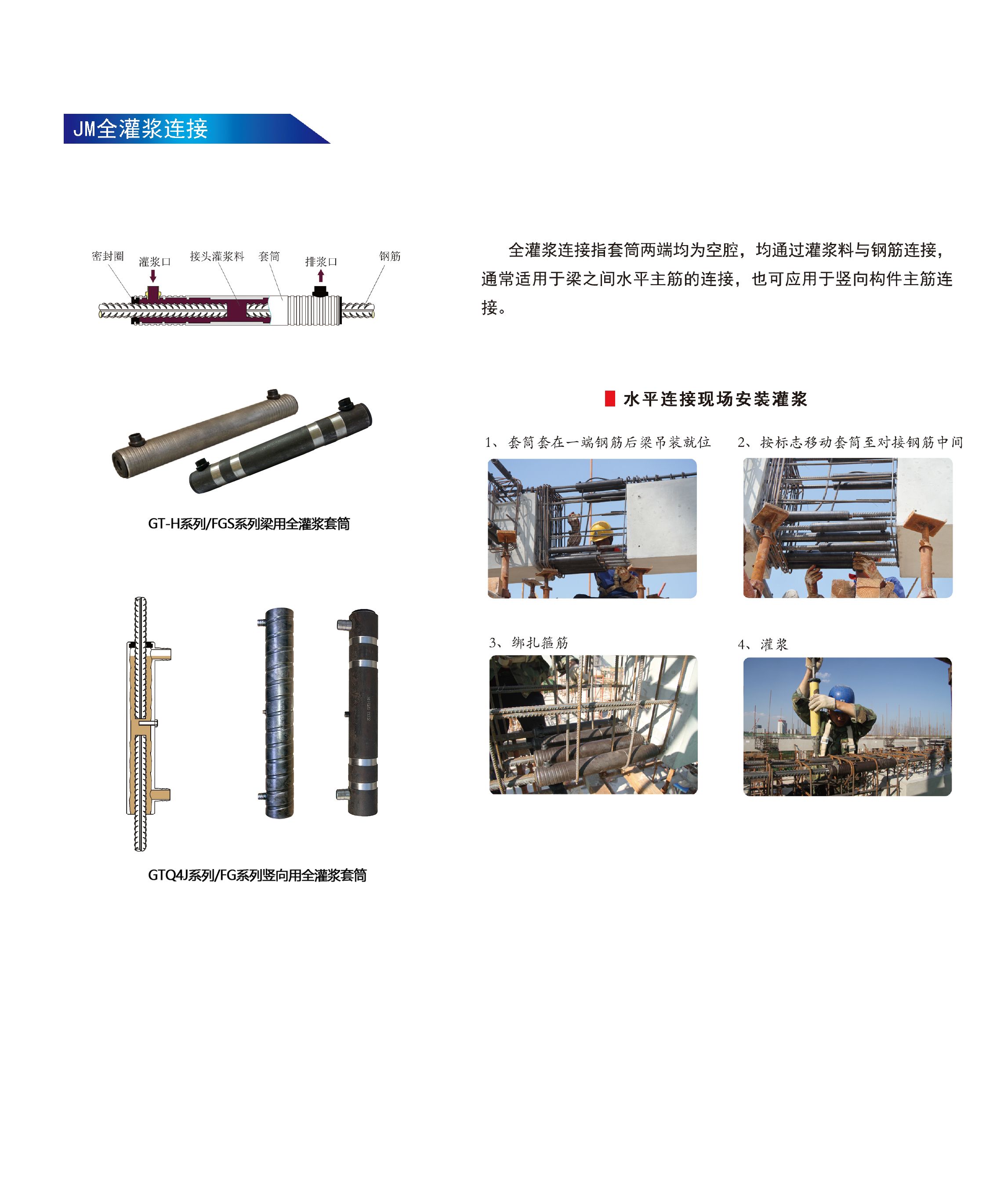 JM全灌浆套筒分为GTH系列竖向用全灌浆套筒和GTQ4J系列梁用全灌浆套筒。此外,还有专用于出口的FG系列竖向用全灌浆套筒,FGS系列梁用全灌浆套筒。